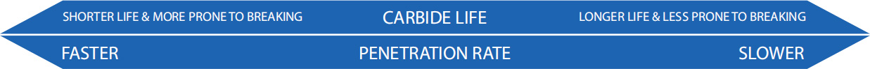 Most face designs for button bits are offered in multiple carbideconfgurations and typically differ in diameter, shape (i.e. profle)and quantity.There are some general guidelines to follow whileselecting between multiple carbide confgurations includingresistance to wear, penetration rate, vibration, and specifc rockconditions.